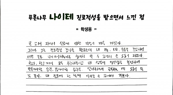 곧 고3이 되어서 진로에 대한 걱정이 계속 커졌다. 그러다 오늘 진로적성 검사를 받았는데 내 지능, EQ 등등을 분석하여 어떤 길로 나아가야 하는지를 상세히 알 수 있어서 큰 도움이 되었다. 학과, 학교까지 모두 추천해주시고 내 성격의 장단점을 분석하여 만들어야 할 습관, 끊어야할 습관을 알려 주셔서 공부하는 데 도움이 될 것 같다. 내 진로에 한 발짝 다가갈 수 있어서 기쁘다.